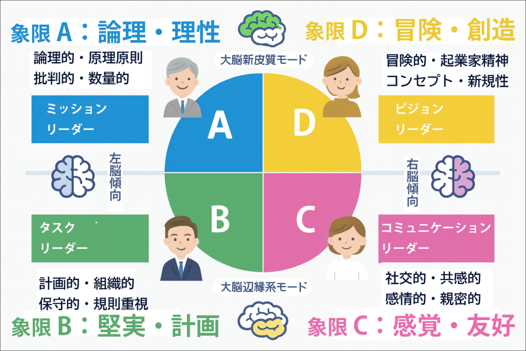 感情・共感・チームワーク・対人関係が強み。ストーリーで理解。 - D象限:大脳新皮質 × 右脳