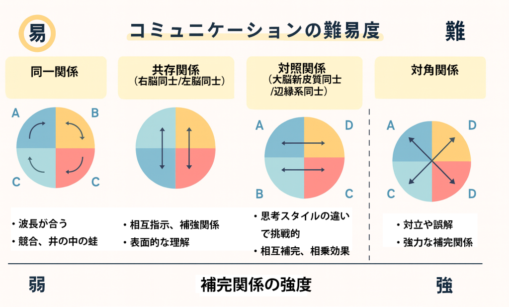 同一関係(A-A/B-B/C-C/D-D)は波長が合い進行は速い反面、視野が偏りやすい。共存関係(A-B、C-D)は相互強化が働く一方、理解の取り違えで見落としが発生しがち。対照象限(A-D、B-C)は補強・合成に向くが、スタイル差が挑発的に映る場合があります。最も誤解が生まれやすいのは対角関係(A-C、B-D)で、数値・図解・段取り・物語などの共通言語で“翻訳”することが突破口になります。